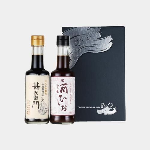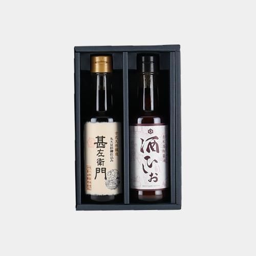丹後産丸大豆を使い、木桶で3年間熟成醗酵してつくる濃口醤油「甚左衛門」と、向井酒造がつくる赤米酒「伊根満開」の酒粕を使った醤油「酒ひしお」のセット。